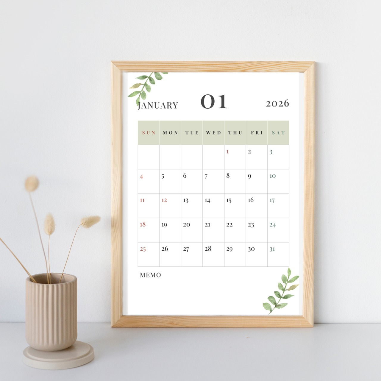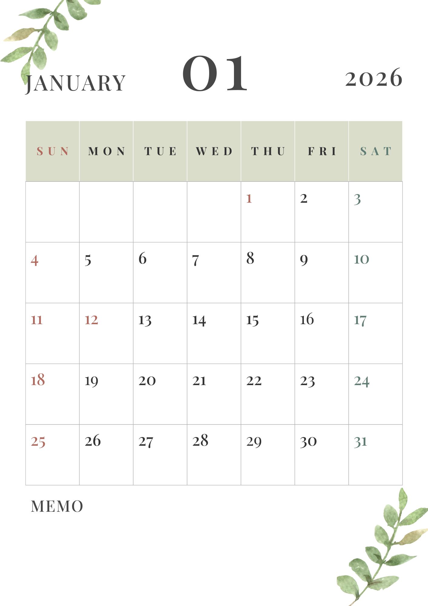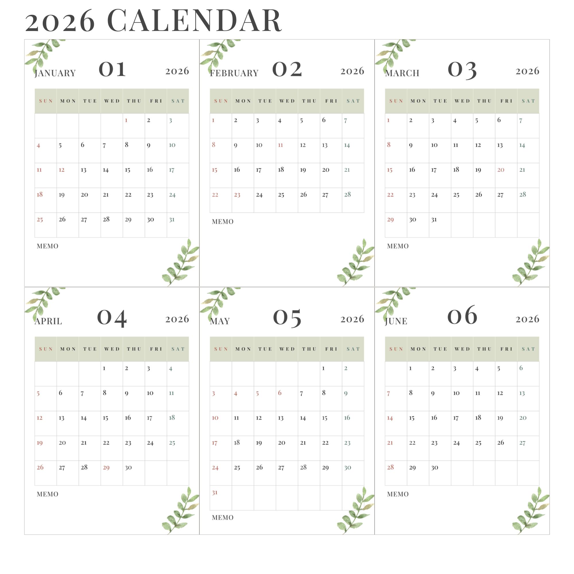 2026年の予定管理に便利な、ナチュラルテイストのシンプルカレンダーです。